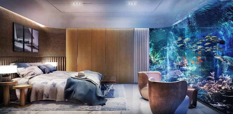 Properties in the Floating Seahorse Dubai include 133 villas, mainly available in 1 to 4-bedroom layouts. These three-level villas are spread over 4,004 sq. ft. and are equipped with state-of-the-art facilities. The underwater floor consists of the bedroom with an attached en-suite bathroom and a sitting area. The sea level has a living area, kitchen and sun deck, while the upper floor has a lounge, balcony and glass-bottomed Jacuzzi.